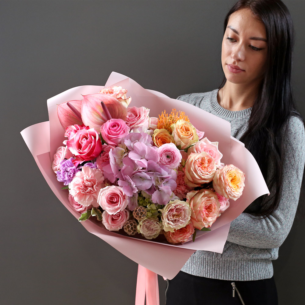 Букет в переливающейся гамме из сиреневой в персиковую. В составе несколько сортов роз, гортензии, антуриумы, диантусы и др.