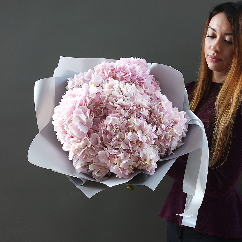 Нежно-розовые гортензии в стильной упаковке.